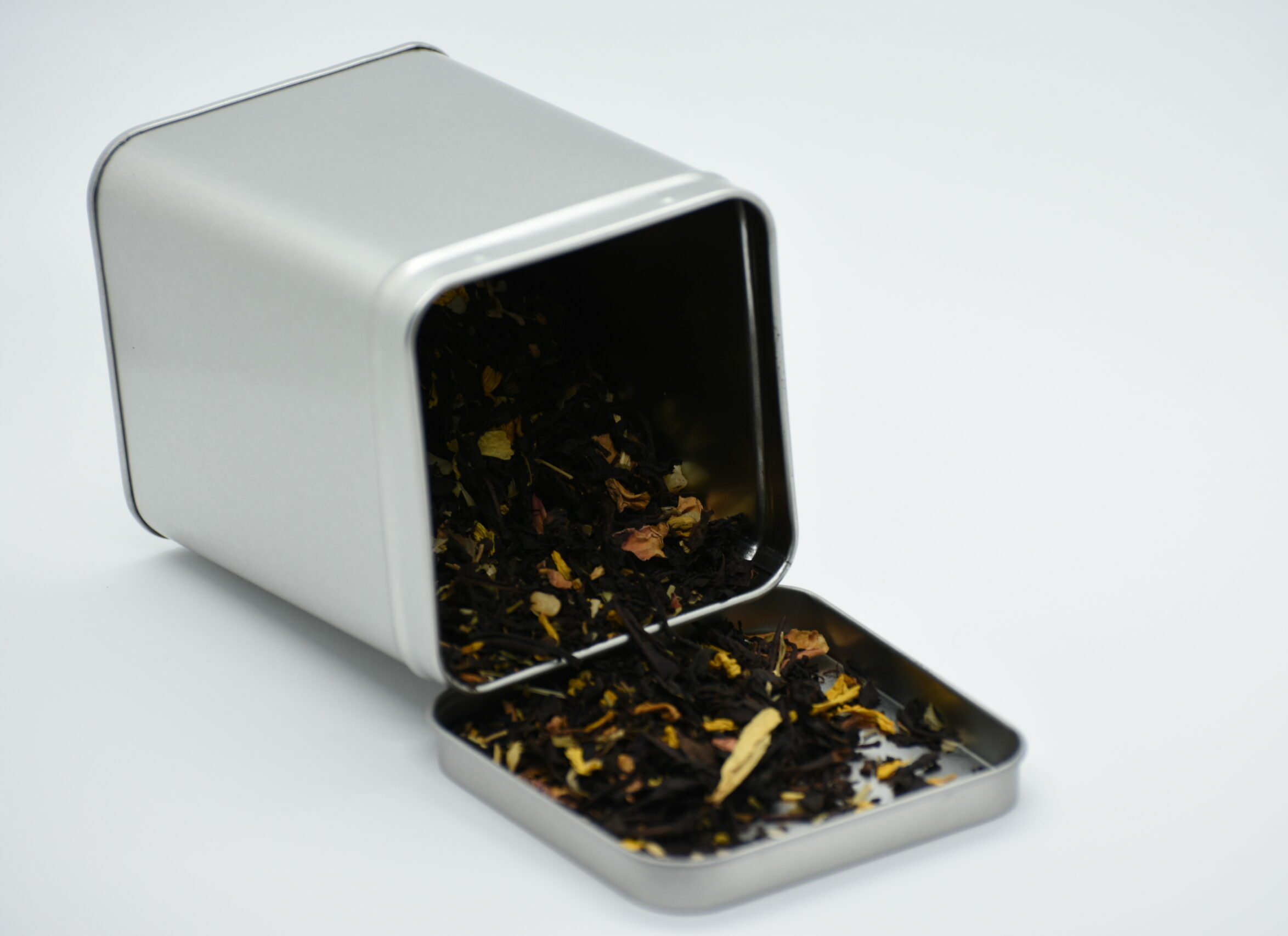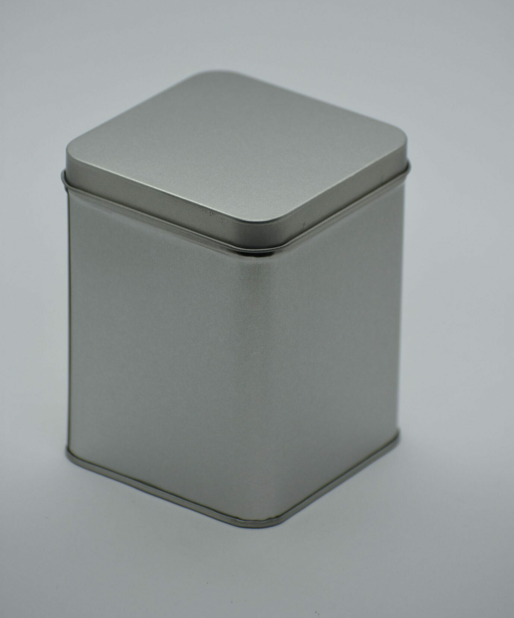 Een zilverkleurig voorraadblikje. Het is een handig blikje om losse thee droog en donker te bewaren.